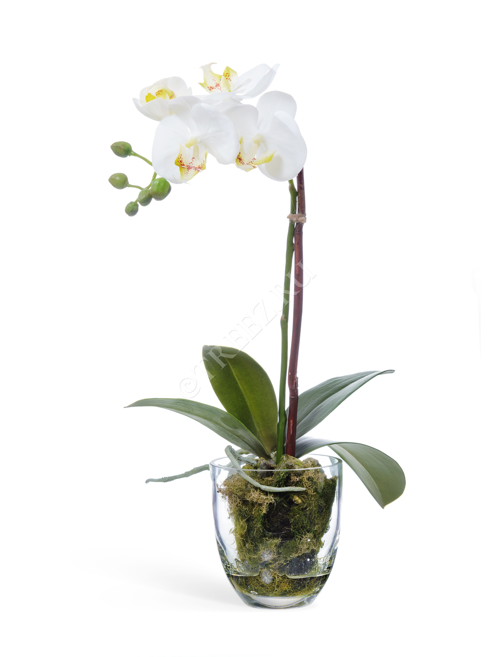 Поставляется готовой композицией в стекле с имитацией мха, земли и воды.